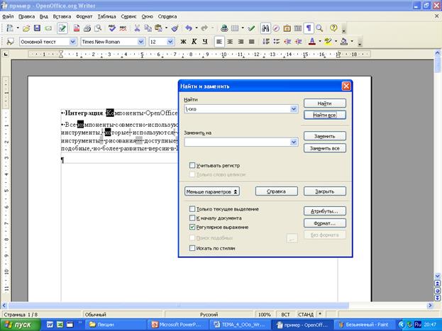 Использование групповых символов (регулярные выражения) Групповые символы (также известные как регулярные выражения) представляют собой комбинации символов, которые задают OOo как найти то, что надо. Они могут экономить время и усилия, объединяя многократные поиски в один. Таблица 1 показывает несколько регулярных выражений, используемых в OOo. Примечание Чтобы искать символ, который определен как групповой символ, введите обратный слеш (\) перед символом. Например, чтобы найти текст $5.00, Вы должны задать в качестве условия поиска \$5\.00. Для использования групповых символов и регулярных выражений при поиске и замене: 1. В диалоговом окне Найти и заменить, нажмите Дополнительные настройки чтобы увидеть дополнительные параметры. В этом расширенном диалоговом окне (Рис. 49), установите флажок Регулярное выражение. 2. Введите текст для поиска, включающий групповые символы в поле Найти и текст замены (если требуется) в поле Заменить на. Не все регулярные выражения работают как символы замены; разрыв строки (\n) один из тех, которые действительно работают. 3. Нажмите Найти, Найти все, Заменить или Заменить все (не рекомендуется).