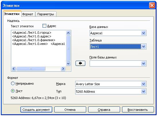 Из выпадающего списка Поле базы данных выберите первое поле, используемое в этикетке (в данном примере, Город). Нажмите кнопку со стрелкой влево для перемещения этого поля в область Текст Этикетки. Выберите все необходимые поля. Затем нажмите Создать документ. Выполните Файл – Печать. В появившемся окне нажмите Да.