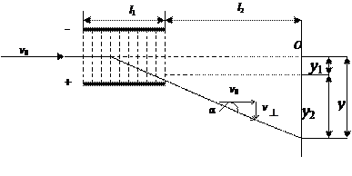 Визначимо зсув напрямку пучка, що відбувається під впливом перепендикулярного до пучка однорідного електричного поля, що діє на шляху довжиною l 1. Нехай спочатку швидкість частинок дорівнює v 0. Потрапивши в область поля, кожна частинка буде рухатися з постійним за величиною і напрямком, перпендикулярним до v 0 прискоренням