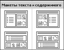 У разі одночасного розміщення на слайді текстових, графічних і мудьтимедійних об’єктів макет слід вибирати серед елементів списку Макеты текста и содержимого області завдань Разметка слайда: