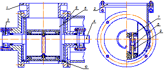 Рис. 1.3.2. Делительная головка тестоделителя 1 - цилиндрический корпус; 2 - торцовая крышка; 3 - подшипник; 4 - цапфа; 5 - цилиндр; 6 - гильза; 7 - днище поршня; 8 - винт; 9 - пружина; 10 – ограничитель