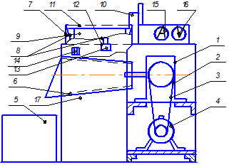 Рис.2.6. Общий вид машины для измельчения монолита масла: 1 - каркас; 2 - редуктор; 3 - ременная передача; 4 - электродвигатель; 5 - сборник измельченного продукта; 6 - ротор-измельчитель; 7 - бункер загрузочный; 8 - вставки; 9 - груз; 10 - индикатор уровня; 11 - решетка предохранительная; 12 - микровыключатель блокировки привода; 13 -упор-ограничитель хода грузов; 14 - кнопки ПУСК и СТОП; 15 - амперметр; 16 - вольтметр; 17 - панель ограждения