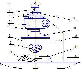 Рис.1.15.1. Общий вид устройства МОК-1 для механизированного отмывания клейковины: 1 - замки; 2 - рабочий орган; 3 - верхняя дека; 4 - крышка; 5 - редуктор; 6 - регулятор зазора; 7 - вал; 8 - фиксатор; 9 - водило; 10 - стеклянная трубка; 11 - стойка; 12 - нижняя лека; 13 – штуцер