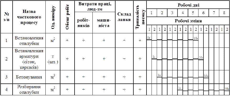 Для побудови лінійного графіка (або циклограми) рекомендується спочатку виконати технологічні розрахунки у розрахунково-пояснювальній записці. При цьому окремі робочі процеси у складі залізобетонних робіт об'єднують у часткові потоки, виконання яких доручають спеціалізованим ланкам. Розрахунки виконують в табличній формі (табл. 2.4). У таблиці технологічних розрахунків тривалість часткового потоку визначається за формулою: