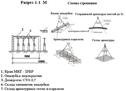 1 – опалубка; 2 – усиливающие ребра опалубки; 3 – схватка; 4 – организация рабочего шва; 5 – бадья; 6 – приемная воронка; 7 – звеньевой хобот; 8 – вибратор; 9 - арматура