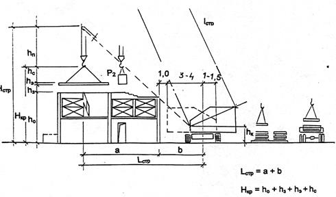Рис.1 Схема определения требуемых параметров крана. Требуемый вылет стрелы и высоту подъема крюка определяют графически путем построения в масштабе схемы, аналогичной приведенной на рис. 1. Принятые схемы с размерами и отметками, помещают в пояснительной записке. При производстве строительно-монтажных работ башенными кранами необходимый вылет крюка определяется в зависимости от ширины здания и расстояния от крана до возводимого здания (рис. 2). При возведении надземной части требуемый вылет Lтр определяется по формуле