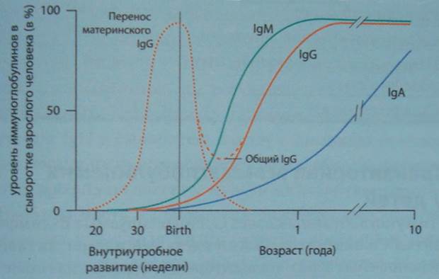 С трансплацентарным переходом в патологических условиях IgG связывают развитие таких заболеваний новорожденных как аллоиммунные, или изоиммунные цитопении (нейтропении, тромбоцитопении) у детей матерей, страдающих аутоиммунными цитопениями; гемолитической болезни новорожденных при АВ0-, резус-несовместимости или несовместимости эритроцитов по редким факторам; неонатальной красной волчанки обычно при переходе аутоантител к Rо-антигенам клеточных ядер от матерей, страдающих системной красной волчанкой; врожденного тиреотоксикоза у детей матерей с аутоиммунным диффузным токсическим зобом вследствие проникновения через плаценту тиреоидстимулирующих антител. В то же время, отсутствие свободного транспорта IgМ от матери (к данному классу принадлежат естественные материнские антитела, в том числе групповые изогемагглютинины) предотвращает гемолитическую болезнь новорожденных по системе АВ0 в случае гетероспецифической (разные группы крови матери и ребенка) беременности. Сыворотка пуповинной крови содержит также небольшое количество IgМ (10% его уровня у взрослых) и несколько нанограммов IgA, IgD и IgE. Поскольку для этих иммуноглобулинов плацента непроницаема, они, по-видимому, образуются в организме плода. В «стерильный» плод, таким образом, поступают некоторые антигены из крови матери, вызывая у него иммунные реакции. Действительно, при атопическом дерматите у грудных детей иногда обнаруживаются антитела к антигенам, с которыми ребенок ранее не сталкивался. По всей вероятности, синтез таких антител (класса IgE) индуцируется у плода антигенами пищи матери. В ряде случаев такие антигены обнаруживали в амниотической жидкости. Высокий уровень IgМ-антител в сыворотке крови является маркером внутриутробных инфекций. В течение первых месяцев происходит распад и удаление IgG, переданных трансплацентарно от матери. Период «полужизни» IgG составляет 21 день. Высокая концентрация IgG в первые месяцы жизни обуславливает защиту организма от грамположительных бактерий и вирусов, а также неэффективность вакцинации в этом возрасте – антигены вакцин связываются циркулирующими материнскими антителами. Поскольку в крови недоношенных детей к моменту рождения содержится мало IgG, опсонизирующая активность их крови снижена по отношению ко всем микроорганизмам. Этим объясняется, в частности, высокая частота сепсиса у недоношенных детей, увеличивающаяся обратно пропорционально гестационному возрасту и массе тела при рождении. Материнский IgG, прошедший через плацентарный барьер, исчезает из организма ребёнка к шестому месяцу жизни. Результатом этого является «физиологический провал» в уровне IgG, наблюдаемый между 3 и 6 месяцами жизни ребёнка, что обуславливает повышенную чувствительность детей данного возраста к инфекциям. По мере синтеза собственных IgG уровень данного иммуноглобулина начинает медленно увеличиваться. Однако у ряда детей эта физиологическая гипогаммаглобулинемия сохраняется после 6-месячного возраста. В этих случаях говорят о преходящей (транзиторной) младенческой гипогаммаглобулинемии грудных детей. Количество Т- и В-лимфоцитов, а также функция Т-лимфоцитов и специфическое антителообразование нормальны. Данное состояние, являющееся пограничным между нормой и патологией и расцениваемое еще как поздний иммунолог