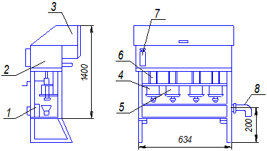 Рис.1.23.1. Общий вид дозировочной станции ВНИИХП-0-6: 1 - пульт управления; 2 - питающий бак; 3 - электропривод; 4, 5 - камерные дозаторы; 6 - указатель производительности дозатора; 7 -электроконтактный термометр; 8 - сливная труба