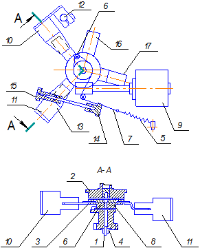 При повороте якоря, флажки должны входить с равномерными боковыми зазорами в щели переключателей 10 11, что обеспечивается осевым смещением кронштейнов, на которых они установлены. Первым должен входить флажок 16 в нижний переключатель 11, который отключает приводную электромагнитную муфту. Второй флажок 17 должен входить в верхний переключатель 10 позже, через некоторый промежуток времени. Второй переключатель 11 отключает магнит механизма регулирования дозы и включает тормозную электромагнитную муфту. Промежуток 6...8 мм между заходами флажков в переключатели регулируется радиальным смещением переключателя 10 на оси 12 и смещением переключателя 11 на оси 13 винтом 14 и стопорят гайкой.