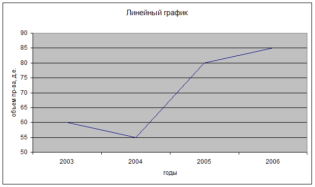 Оба показателя откладываются на шкалах (каждый на своей), третий (результат) изображается в виде прямоугольника в поле графика. Средний размер вклада, умноженный на их число, дает общую сумму вкладов, что и отображается в виде площади (данные в центре прямоугольников, млрд. руб.). Диаграммы динамики. Для изображения и внесения суждений о развитии явления во времени строятся диаграммы динамики. В рядах динамики используются для наглядного изображения явлений многие диаграммы: столбиковые, ленточные, квадратные, круговые, линейные, радиальные и другие. Выбор вида диаграмм зависит в основном от особенностей исходных данных, от цели исследования. Например, если имеется ряд динамики с несколькими неравноотстоящими уровнями во времени (1913, 1940, 1950, 1980,1985, 1995), то часто для наглядности используют столбиковые, квадратные или круговые диаграммы. Они зрительно впечатляют, хорошо запоминаются, но не годны для изображения большого числа уровней, так как громоздки, и если число уровней в ряду динамики велико, то целесообразно применять линейные диаграммы, которые воспроизводят непрерывность процесса развития в виде непрерывной ломаной линии. Кроме того, линейные диаграммы удобно использовать: когда целью исследования является изображение общей тенденции и характера развития явления; когда на одном графике необходимо изобразить несколько динамических рядов с целью их сравнения; когда наиболее существенным является сопоставление темпов роста, а не уровней. Для построения линейных диаграмм используют систему прямоугольных координат. Обычно по оси абсцисс откладывается время (годы, месяцы и т.д.), а по оси ординат - размеры отображаемых явлений или процессов.