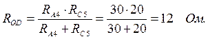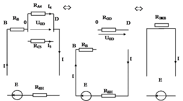 Получаем следующую эквивалентную схему 6в. В данной схеме сопротивления R А4 и R С5 включены параллельно. Заменим их на эквивалентный им резистор с сопротивлением R OD, рассчитанным по формуле: После проведенного преобразования схема 6в трансформируется в схему 6г, в которой резисторы с сопротивлениями R В, R OD, R ВН включены между собой последовательно. Заменим их на общий эквивалентный им резистор с сопротивлением R ЭКВ, найденным по формуле: