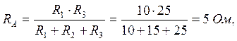 Выберем направление неизвестных токов I, I 1, I 2, I 3, I 4, I 5 произвольным образом (как показано на рис. 6а). Обозначим места соединения элементов электрической цепи точками A, B, C, D. Как видно из рис. 6а. в электрической схеме нет ни последовательного, ни параллельного, ни смешанного соединения резисторов. Следовательно, эту задачу решим преобразовав резисторы с сопротивлениями R 1, R 2, R 3, соединенные треугольником АВС в эквивалентную звезду с сопротивлениями R А, R В, R С. Для этого мысленно опускаем лучи из узлов А, В, С в одну общую точку О (узел 0). Можно доказать, что сопротивления резисторов, находящихся на этих лучах, вычисляются по формулам: