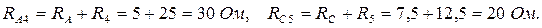 После проведенных преобразований резисторы R 1, R 2, R 3 из исходной схемы исключаются, в результате получаем следующую эквивалентную схему. (Рис. 6б.) В этой схеме токи I 4, I 5, I остаются теми же самыми (по величине и по направлению), что и на рис. 6а, поскольку данная часть схемы не была затронута выполненным преобразованием. Анализ электрической схемы рис. 6б показывает, что резисторы с сопротивлениями R А и R 4, а также резисторы с сопротивлениями R С и R 5 включены последовательно. Заменим их на эквивалентные им резисторы с сопротивлениями R А4 и соответственно R С5 :