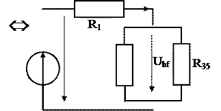 Рис. 8в. Рис. 8г. Как видно из рис. 8а точки b и f – места соединения трех ветвей, следовательно, данные точки являются узлами электрической цепи. Точки Выберем направление неизвестных токов I 1, I 2, I 3, произвольным образом (как показано на рис. 8а). Последовательно соединенные резисторы с сопротивлениями R 2, R 4 и R 3, R 5 заменяем соответственно на резисторы с эквивалентными сопротивлениями R 24 и R 35: R 24 = R 2 + R 4 = 25+50=75 Ом. R 35 = R 3 + R 5 =25+25=50 Ом. Исходную схему (рис. 8а) преобразуем в эквивалентную (рис. 8б). Параллельно соединенные резисторы с сопротивлениями R 24 и R 35 заменяем на резистор с эквивалентным сопротивлением R 2435 по формуле: