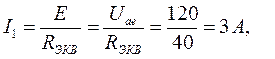 Преобразованную схему (рис. 8б) заменяем на эквивалентную (рис. 8в). Общее эквивалентное сопротивление всей цепи равно: R ЭКВ = R 1 + R 2435 = 10+30=40 Ом. Таким образом, после проведенных выше преобразований исходная схема (рис. 8а) трансформируется в эквивалентную (рис. 8г). Определим силу тока I 1 на входе цепи (рис. 8г), что соответствует показанию амперметра А1 (рис. 8а):