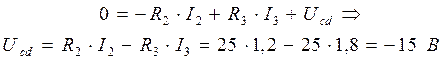 Знак «-» говорит о том, что мы неправильно выбрали истинное направление падения напряжения (на рис. 8а это направление показано пунктиром). Истинное (физическое) направление падение напряжения от потенциала d к потенциалу c Þ Udc = 15 В (на рис. 8а это направление показано сплошной линией). Если падение напряжения измеряется вольтметром электромагнитной системы [1], то направление падения напряжения не влияет на показание прибора. Если же падение напряжения измеряется вольтметром магнитоэлектрической системы [1], то необходимо учитывать направление падения напряжения и правильно включить прибор, в противном случае стрелка измерительного прибора будет отклоняться в противоположную сторону. В обоих случаях вольтметры разной системы покажут V2 =15 В. Показание вольтметра V2 можно также определить через электрические потенциалы: пусть jB =0, тогда jd = jB – R 2× I 2 = 0 – 25×1,2 = – 30 B, а jС = jB – R 3× I 3 = 0 – 25×1,8 = – 45 B, V2 = Udc= jd – jC = – 30– (– 45) = 15 В. ПРИМЕЧАНИЕ. В электротехнике принято, что ток течет от точки более высокого потенциала к точке более низкого потенциала (от «+» к «-»). Так как мы идем по направлению тока, то потенциал jd меньше jB на величину падения напряжения на резисторе R 2, а jС меньше jB на величину падения напряжения на резисторе R 3. Проверим правильность проведенных расчетов по балансу мощностей: