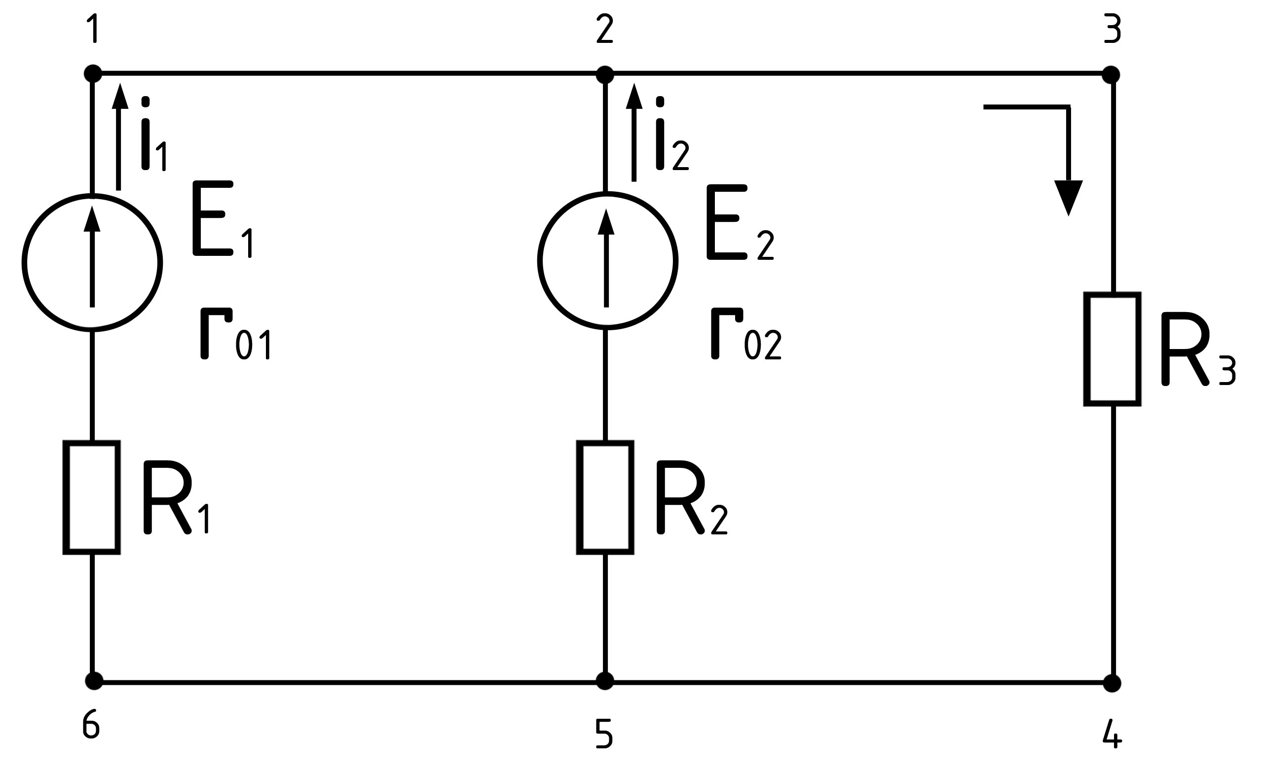 Пример: Запишем II з. Кирхгофа для контура 1-2-5-6-1. Обходим контур по часовой стрелке: E1-E2=I1R1+I1r01-I2R2-I2r02.