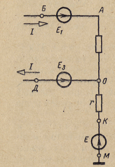 На участке ВГ изменение потенциала обусловлено двумя причинами: действием э. д. с. Е2 и падением напряжения на сопротивлении r02. Электродвижущая сила Е2 вызывает уменьшение потенциала точки Г (точка Г является зажимом «–» источника, а точка Д – зажимом «+»). Падение напряжения на внутреннем сопротивлении источника (r02I) вызывает увеличение потенциала точки Г, так как ток направлен от точки Г к точке В. Поэтому