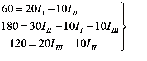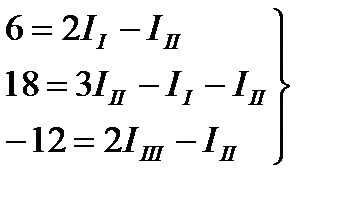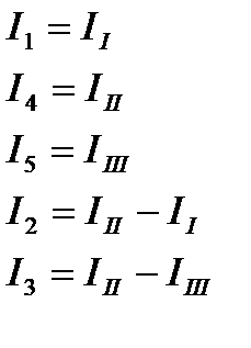 1. Разобьём схему на три контура: I1, I2, I3. 2. Получим три контурных тока, направленных по часовой стрелке: I1, I2, I3. 3. Выразим действительные токи ветвей через контурные: