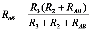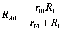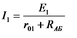 Ещё раз отметим, что токи I1 и I3 вычисляются при отключенной внешней цепи (ветви с ЭДС Е2). Общее сопротивление относительно точек Б и В найдём как параллельное соединение сопротивления R3 и сопротивлений R2 и RАБ, включенных относительно точек Б и В последовательно. В очередь сопротивление RАБ определяем как эквивалентное параллельное параллельному соединению сопротивлений r01 и R1 в узловых точках А и В. Итак,