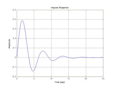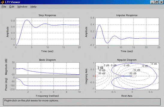 3. Построим переходную функцию командой step(w). Результат ее выполнения приведен на рис. 17. 4. Построим импульсную переходную функцию командой impulse(w). Результат показан на рис. 18. 5. Диаграмму Боде получим, используя команду bode(w) - рис. 19. 6. Определим частотный годограф Найквиста, выполнив команду nyuivist(w) - рис. 20. Аналогичные результаты (рис. 21) можно получить, используя команду ltiviewer(w), с соответствующими настройками в меню "Plot Configuration".
