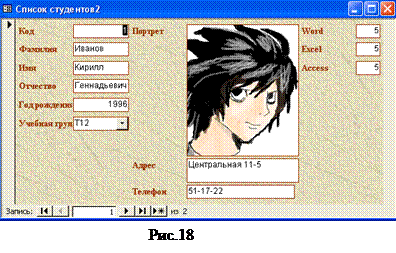 4. Перейдите в режим формы. Щелкните по ячейке, где должно быть значение поля «Портрет». Выберите пункт контекстного меню Добавить объект, Paintbrush Picture. Щелкните по кнопке ОК. Нарисуйте рисунок или вставьте рисунок из файла. Результат изображен на рисунке18 Задание 2. Добавление в таблицу «Список студентов» логического поля. Добавление поля в форму. 1. Перейдите на вкладку Таблицы. Откройте таблицу «Список студентов» в режиме конструктора. Добавьте поле с именем «Стипендия» (для размещения информации о том, получает ли студент стипендию) и типом Логический. Сохраните таблицу и закройте ее. 2. Перейдите на вкладку Формы. Откройте форму «Список студентов» в режиме конструктора. Замечание. В форме или в отчете флажок может быть использован как отдельный элемент управления, в котором отображаются значения логического поля из базовой таблицы. Если флажок установлен, поле в таблице имеет значение «Да», если флажок снят, поле имеет значение «Нет». 3. Щелкните по кнопке Список полей. Выделите название «Стипендия» и перетащите его мышью в область данных. Появится значок флажка и надпись «Стипендия». 4. Перейдите в режим формы и посмотрите разные записи. Флажок снимается и устанавливается щелчком по соответствующему полю. Закройте форму с сохранением. Задание 3. Открыть форму «Список студентов» в режиме конструктор и отредактируйте форму по образцу: шрифт имен полей– 12, шрифт значение полей – 14, цвет и размещение как на рисунке 19.