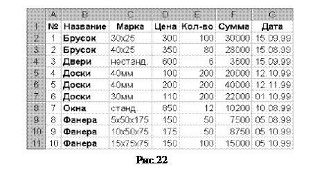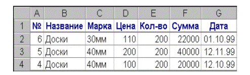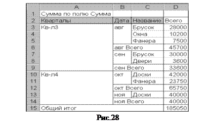 Рис.26 7. Просмотреть детализированную информацию о содержимом ячеек сводной таблицы. Повторить группировку данных сводной таблицы по кварталам (рис.4). Для этой сводной таблицы установить курсор в непустую ячейку, например ячейку D4 ("Доски" - "Кв-л4"), и нажать в панели "Сводные таблицы" кнопку "Отобразить детали". Просмотреть в открывшемся листе детализированные данные по наименованию "Доски", проданные в 4-м квартале. Сравнить результат с представленным на рисунке 27.