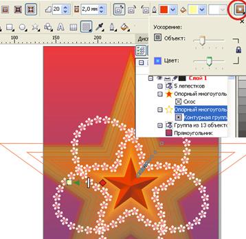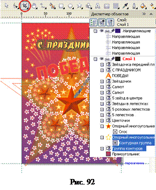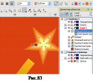 32. Над верхним концом полоски добавим небольшую звёздочку и создадим у звёздочки небольшую контурную группу так же, как это делали с большой звездой. Смотри рисунок 83 Далее создайте группу салюта на основе созданного элемента изображения, используя небольшие простейшие трансформации для полоски дымного шлейфа (сжатие - растяжение по ширине и высоте и вращение, а также отражение). 33. Теперь перейдём к добавлению надписей. Выберете инструмент Текст и наберите: С ПРАЗДНИКОМ.