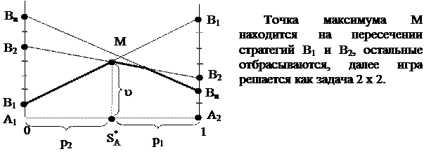 Минимум М находится на пересечении стратегий А1 и Аm, остальные отбрасываются, далее игра решается как задача 2 х 2.
