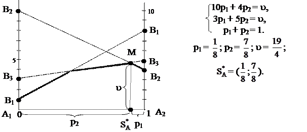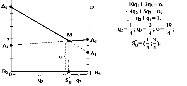 Решим задачу графически и аналитически. Для игрока А: получаем игру 2 х 2, используя стратегии В2 и В3 игрока В: