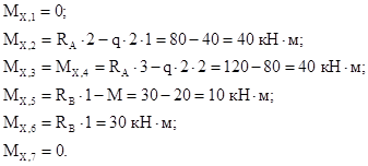 Строим эпюру 4. Определяем изгибающие моменты в характерных сечениях.