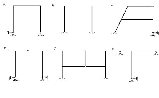 Плоской рамой называется стержневая система, элементы которой жестко или шарнирно соединены между собой, нагруженная в своей плоскости. Вертикально (или под наклоном) расположенные стержни рамы называются стойками, а горизонтальные - ригелями. Жесткость узлов устраняет возможность взаимного поворота скрепленных стержней, то есть в узловой точке углы между их осями остаются неизменными. Как и многие другие системы, рамы делятся на статически определимые и статически неопределимые (рис.10, б,в,д,е). Промежуточный шарнир снижает степень статической неопределимости рамы на величину m - 1, где m - число стержней, сходящихся в шарнире. Если m >2, то шарнир называется кратным (рис.10,д). Для определения степени статической неопределимости плоской рамы можно воспользоваться формулой: n = 3К-Ш, где n - степень статической неопределимости; К - число замкнутых контуров в предположении полного отсутствия шарниров; Ш- число шарниров в пересчете на одиночные. Основание (земля) рассматривается как стержень. Для рамы (рис.10,б) имеем: К=1; Ш=0;