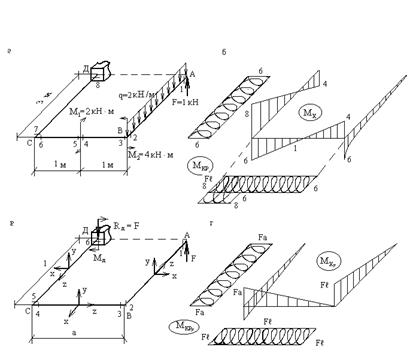 Для достижения максимальной общности будем считать, что сила , момент типа и момент типа (имеется в виду плоскость действия каждого из них) приложены к концевому сечению (т.А на рис.16,а), а распределенная нагрузка приложена к первому от свободного конца участку стержня (стержень АВ на рис.16,а). Причем, все построения будем выполнять в общем виде, полагая, для наглядности, что a< l.