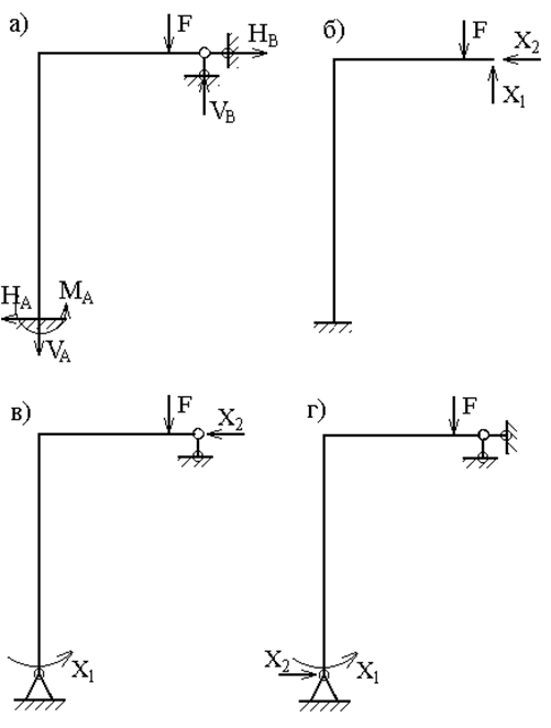 Это важнейший этап расчета, так как рациональный выбор основной системы существенно упрощает вычислительную работу. Рассмотрим возможные способы удаления лишних связей, что и определяет вид основной системы. 1. Отбрасывание лишних связей осуществляется полным удалением некоторых опор или их заменой опорами с меньшим числом связей. Реакции, действующие в направлениях отброшенных связей, являются лишними неизвестными. На рис.34,б, в, г показаны различные варианты эквивалентной системы, полученные этим способом для рамы (рис.34,а). 2.Постановка шарниров в промежуточных сечениях стержней позволяет в каждом таком сечении установить связь, соответствующую изгибающему моменту. Эти моменты являются лишними неизвестными. Для рамы, имеющей степень статической неопределимости n=3 (рис.35,а), при выборе основной системы необходимо поставить три шарнира. Положение этих шарниров может быть произвольным, но удовлетворяющим требованию геометрической неизменяемости системы (рис.35,б). 3. Рассечение стержня устраняет три связи, соответствующие внутренним усилиям M, Q, N (рис.35,в). В частных случаях (рис.35,г) рассечение стержня по шарниру освобождает две связи (рис.35,д), а рассечение прямолинейного стержня с шарнирами по концам – одну связь (рис.35,е).