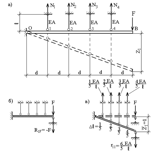 Рис. 49 Степень статической неопределимости зависит от числа вертикальных стержней, в то время как степень кинематической неопределимости такой системы остается равной единице при любом числе стержней. Метод расчета таких систем, рассматриваемый в традиционном курсе сопротивления материалов, также предполагает использование картины деформаций системы, но не является методом перемещений. Здесь же мы рассмотрим решение в форме, характерной для метода перемещений. Определим усилия в стержнях N1, N2, N3, N4, принимая в качестве неизвестного перемещение Z1. Устраним перемещение Z1, введя по его направлению дополнительную связь (рис.49,б). Сформированную таким образом систему назовем основной системой метода перемещений. Сообщим введенной связи принудительное смещение Z1, которое определим из условия равенства нулю суммарной реакции R1 в этой связи, так как в действительности сама связь отсутствует. Будем считать реакцию положительной, если ее направление совпадает с принятым направлением перемещения, и отрицательной – в противном случае. В основной системе от нагрузки F реакция в связи
