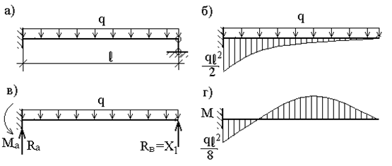 Окончательная эпюра моментов для заданной, теперь уже статически определимой, системы, загруженной силами F и X1 (рис.51,д), показана на рис.51,е. 2. Загружение равномерно распределенной нагрузкой q (рис.52,а) однопролетной статически неопределимой балки (строка 2 вспомогательной таблицы). Для решения вновь используем метод сил. Эпюра моментов от внешней нагрузки, приложенной к основной системе, показана на рис.52,б, а единичная эпюра моментов (и, соответственно, перемещение Уравнение метода сил: