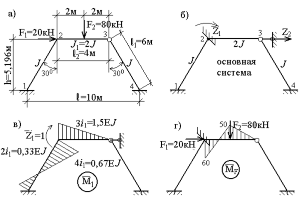 Основную систему образуем путем введения защемления в узле 2 и горизонтального опорного стержня в узле 3 (рис.60,б). Для определения неизвестных перемещений z1 и z2 по направлениям введенных связей запишем систему канонических уравнений метода перемещений: