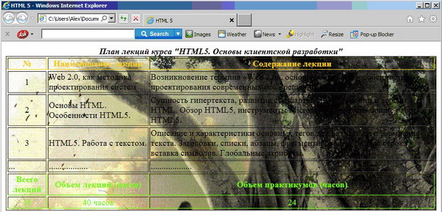 Можно задать все атрибуты стиля, относящиеся к фоновому изображению, воспользовавшись короткой формой записи, например: background: #00FF00 url("image.gif") no-repeat fixed 5cm 4cmВ качестве примера, добавим следующую таблицу стилей веб-странице, на которой прежде была размещена информационная таблица о настоящем курсе ("Работа с таблицами и средства навигации"): thead { color: Gold }table { background-image: url("image.gif")}tfoot { color: Chartreuse }Получим следующий результат:
