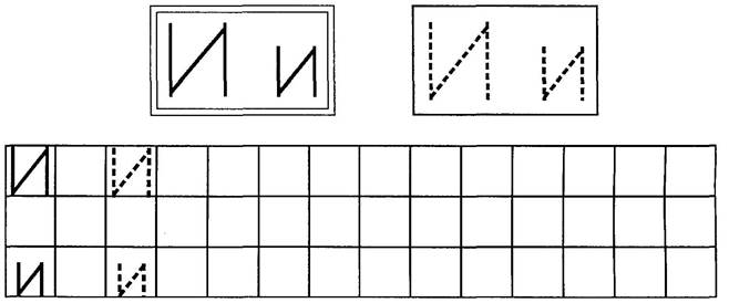 Задание 3. Рассмотри большую и маленькую буквы И в двойной рамочке. Обведи карандашом букву И по точкам. Пропиши строчки букв И.