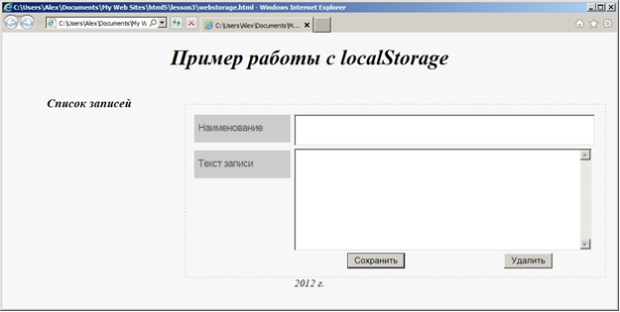 Собственно, теперь можно перейти к сути работы с localStorage. Шаг 3 Нами уже были перечислены необходимые функции. Рассмотрим подробнее создание каждой из них. Сохранение новой записи: function saveNote(){ var name = document.getElementById('notename').value; /* создание переменной, хранящей значение введенное в поле Наименование.*/ var content = document.getElementById('notecontent').value; /* создание переменной для хранения текста самой записи*/ if(content == '') { alert('enter valid note text'); /* выводим предупреждающее сообщение, в случае, если не задан текст записи, см. рис. 4*/ } else { if (name == 0) { alert('enter valid note name'); /* выводим предупреждающее сообщение, если не задано наименование записи, см. рис. 5*/ } else {localStorage[name] = content;} /* созданение записи в localStorage, обратите внимание, что наименование записи является идентификатором, по которому сможем извлечь текст записи*//*Также отметим, что если пользователь выберет уже существующую запись и введет новый текст, без изменения наименования, то, по сути, произойдет редактирование записи, поскольку новое значение текста сохранится поверх старого, соответственно, если будет изменено наименование записи, то, фактически, произойдет создание новой*/ }Date: 2015-07-22; view: 519; Нарушение авторских прав |