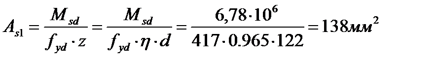 Минимальный класс бетона С16/20, минимальный размер защитного слоя бетона 25мм. Подбор требуемой площади арматуры выполняем по упрощенному деформационному методу. Максимальный изгибающий момент в плитной части (из таблицы) Рабочая высота сечения где 150мм – толщина плиты; 25мм – размер защитного слоя; 6/2мм – половина предполагаемого максимального диаметра рабочей арматуры. Высота сжатой зоны расчетного сечения: