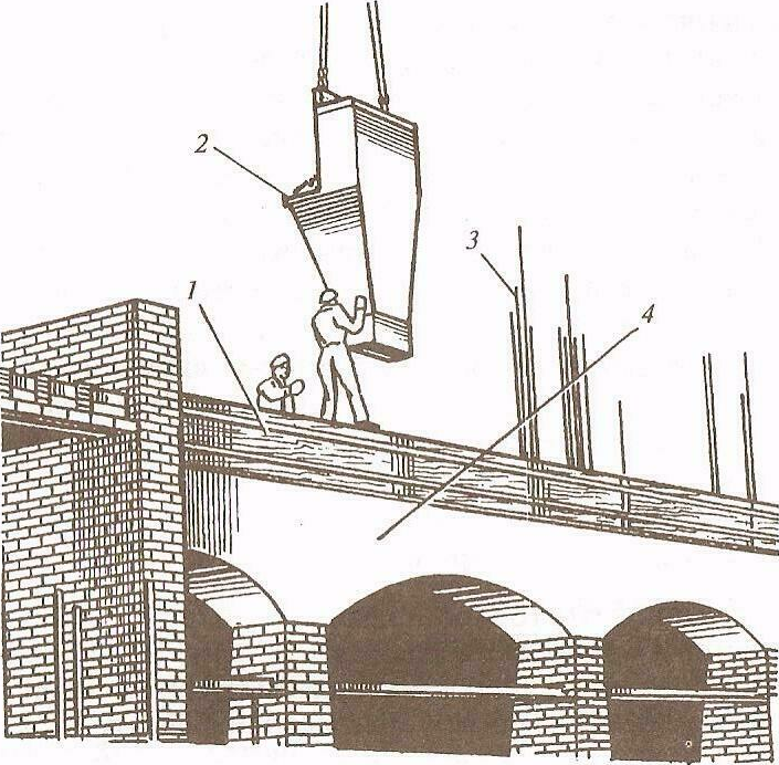 Рис. 2.Устройство элементов из монолитного железобетона в кирпичном здании: 1 — опалубка; 2 — бункер с бетонной смесью; 3 — арматура; 4 — затвердевший бетон