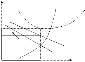MR 0 QA Q Рисунок 1: прибутки фірми в короткостроковому періоді. Дамо поясненняна рисунка. Головна риса цієї діаграми складається в еластичності кривої, що характеризує попит, або продажі, окремого фірми. Фірма буде максимизувати свої прибутки або мінімізувати свої збитки в короткостроковому періоді, виробляя такий обсяг продукції, що позначений перетинанням кривих граничних витрат і граничного прибутку. Фірма (рисунок 1) виробляє обсяг продукції, призначає ціну і може одержати сукупний прибуток у розмірі, що вказаний стрілкою. Але може скластися і меньш сприятлива ситуація з витратами і попитом, що ставить фірму в умовах монополістичної конкуренції в становище, при якому вона зазнає збитків у короткостроковому періоді. Це проілюстровано областю зі стрілкою на рисунка 2.