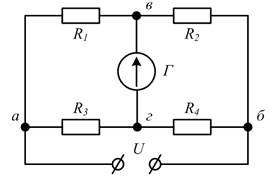 Рис. 2.1. Выражение для тока I, проходящего через гальванометр, можно получить различными способами (например, методом контурных токов). Если принять внутренне сопротивление источника напряжения U равным нулю, то значение тока в цепи гальванометра будет равно