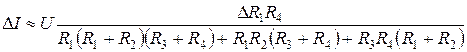 где SI – чувствительность гальванометра к току; ∆ I – изменение тока в выходной диагонали; SCX – чувствительность схемы моста (к току). Если в предварительно уравновешенном мосте изменить одно из сопротивлений плеч, например R1, на величину ∆ R1, то в выходной диагонали моста появляется ток ∆ I, который, при условии ∆ R1 << R1, будет равен
