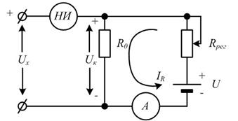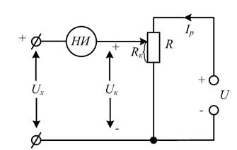 3.1.1. Компенсационный (нулевой) метод измерения заключается в компенсации (уравновешивании) измеряемого напряжения (или другой физической величины) известным. На рис. 3.1 показан принцип компенсационного метода измерения напряжения Ux. Это напряжение компенсируется напряжением Uк, образуемым током Iр (часто называемым рабочим) на известном сопротивлении R0. При измерении ток Iр изменяется с помощью регулировочного сопротивления Rрег до тех пор, пока нуль-индикатор НИ (гальванометр) не покажет отсутствие тока в цепи. Очевидно, что в этом случае Uк = IpR0. Величина R0 известна, значение рабочего тока Iр определяется по показанию амперметра, включенного в цепь Iр.