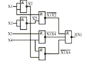 Как следует из полученного аналитического выражения, логическое устройство должно содержать три двухвходовых и один трехвходовой элемент И-НЕ. Функциональная схема комбинационного устройства, построенная в базисе И-НЕ, показана на рисунке.
