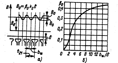 Рис. 9.1. К расчету поверхностных потерь в асинхронных машинах: а – пульсация индукции в воздушном зазоре; б – зависимость