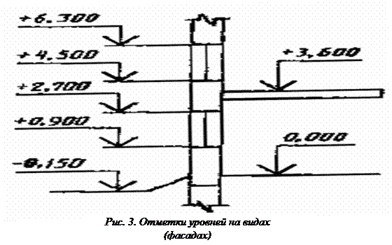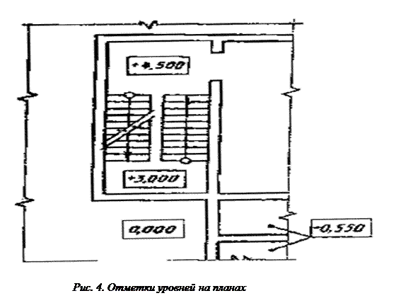 4.3.8. Отметки уровней (высоты, глубины) элементов конструкций, оборудования, трубопровода, воздуховодов и др. от уровня отсчета (условной нулевой отметки) обозначают условным знаком в соответствии с рис. 2 и указывают в метрах с тремя десятичными знаками, отделенными от целого числа занятой. «Нулевую» отметку, принимаемую, как правило, для поверхности какого-либо элемента конструкций здания или сооружения, расположенного вблизи планировочной поверхности земли, указывают без знака: отметка выше нулевой – со знаком «+»; ниже нулевой – со знаком «–». На видах (фасадах), разрезах и сечениях отметки помещают на выносных линиях контура в соответствии с рис. 3. На планах отметки наносят в прямоугольнике размером 14х8(h) в соответствии с рис. 4.