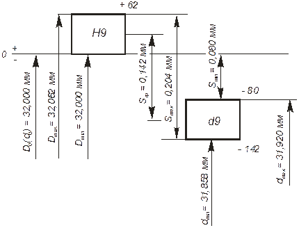 S max = D max – d min = 32,062 – 31,858 = 0,204 мм; S min = D min – d max = 32,000 – 31,920 = 0,080 мм.
